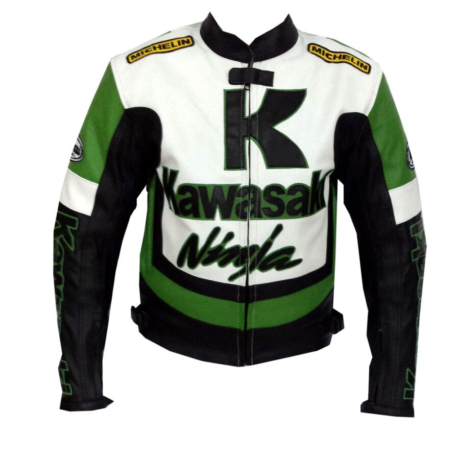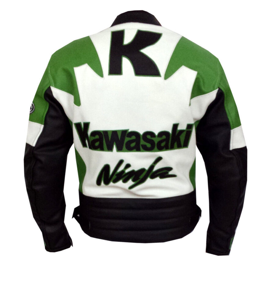 Handmade Biker Leather Jacket (Green & White - Kawasaki)