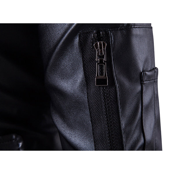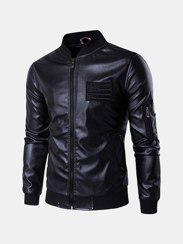 Handmade Flag Embroided Pockets Synthetic Faux Leather Biker Jacket