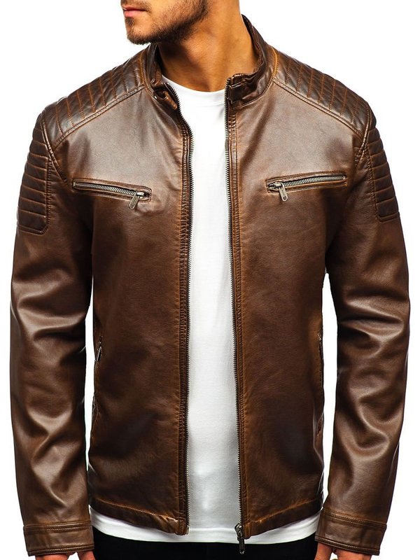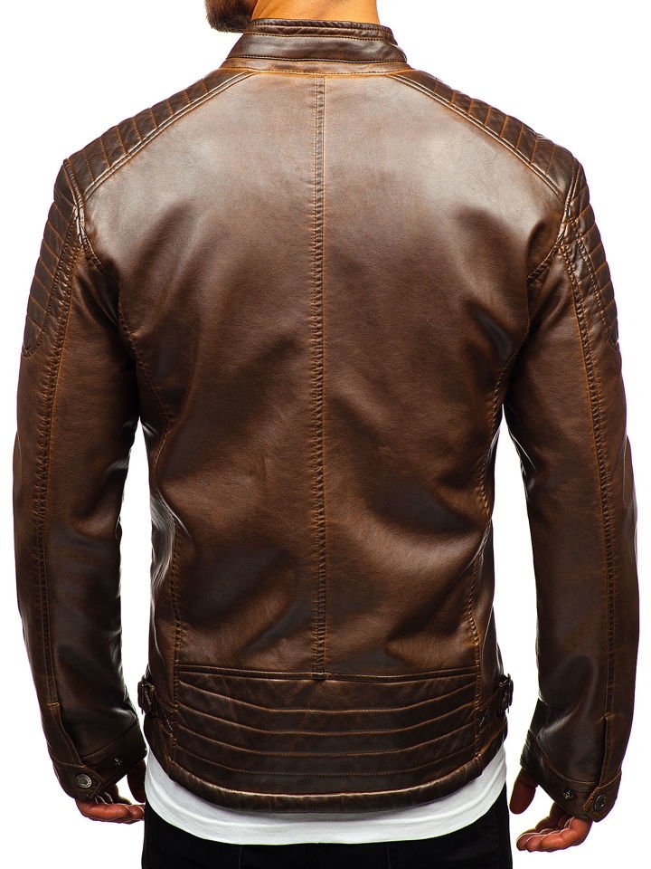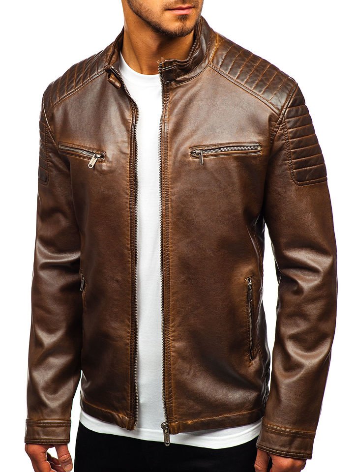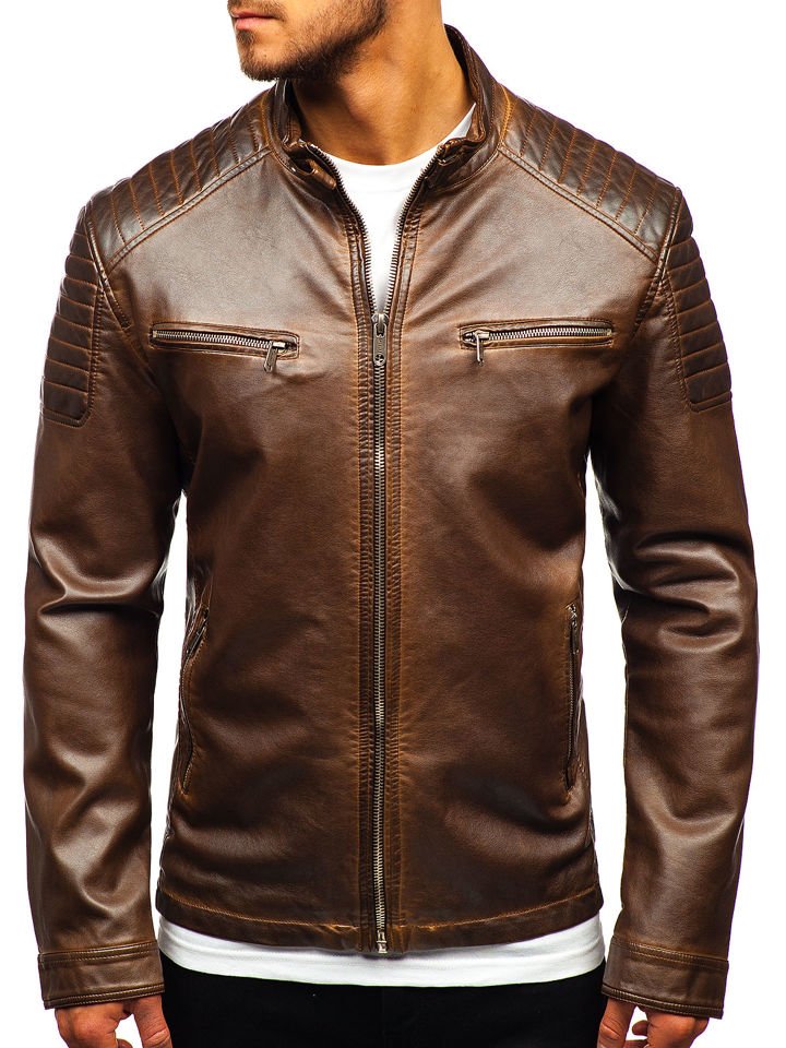 Brown men's jacket Faux leather Zip fastening Snap-stand-up collar Quilted inserts on the shoulders, sleeves and back Four outside and one inside pocket Zip-pockets Snap-adjustable sleeves, bottom with buckles Casual style POLICY : We do get return in case of any damage or misfit , and in case of size change or return shipping charges will e paid by the buyer. Return accepted Un used product within 30 days of Purchase. Customize Products will not return or exchange.