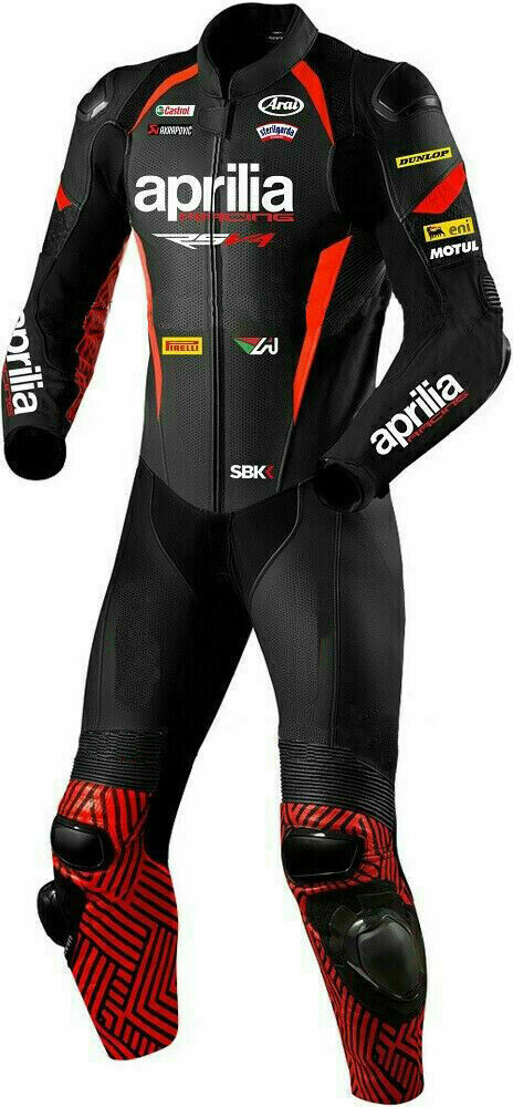 Handmade Men's Motorcycle Leather Aprilia Racing One Piece Suit (Black & Red)